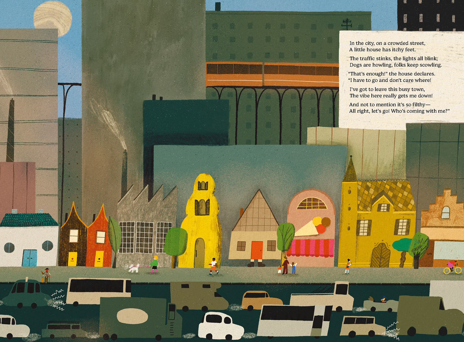 DE• Das Haus zieht aus erzählt die Geschichte einer Häuserstraße, die genug vom Stadtleben hat. Eines Tages beschließen die Häuser kurzerhand, als Karawane in die weite Welt zu ziehen. Auf ihrer Reise begegnet jedes Haus einem Tier, das perfekt zu ihm passt, und bietet ihm ein neues Zuhause. So lichtet sich die Karawane Haus für Haus, bis nur noch eins übrig bleibt. Dieses letzte Haus musste erst die ganze Welt bereisen, um die alte Stadt als Lebensraum wieder schätzen zu können.