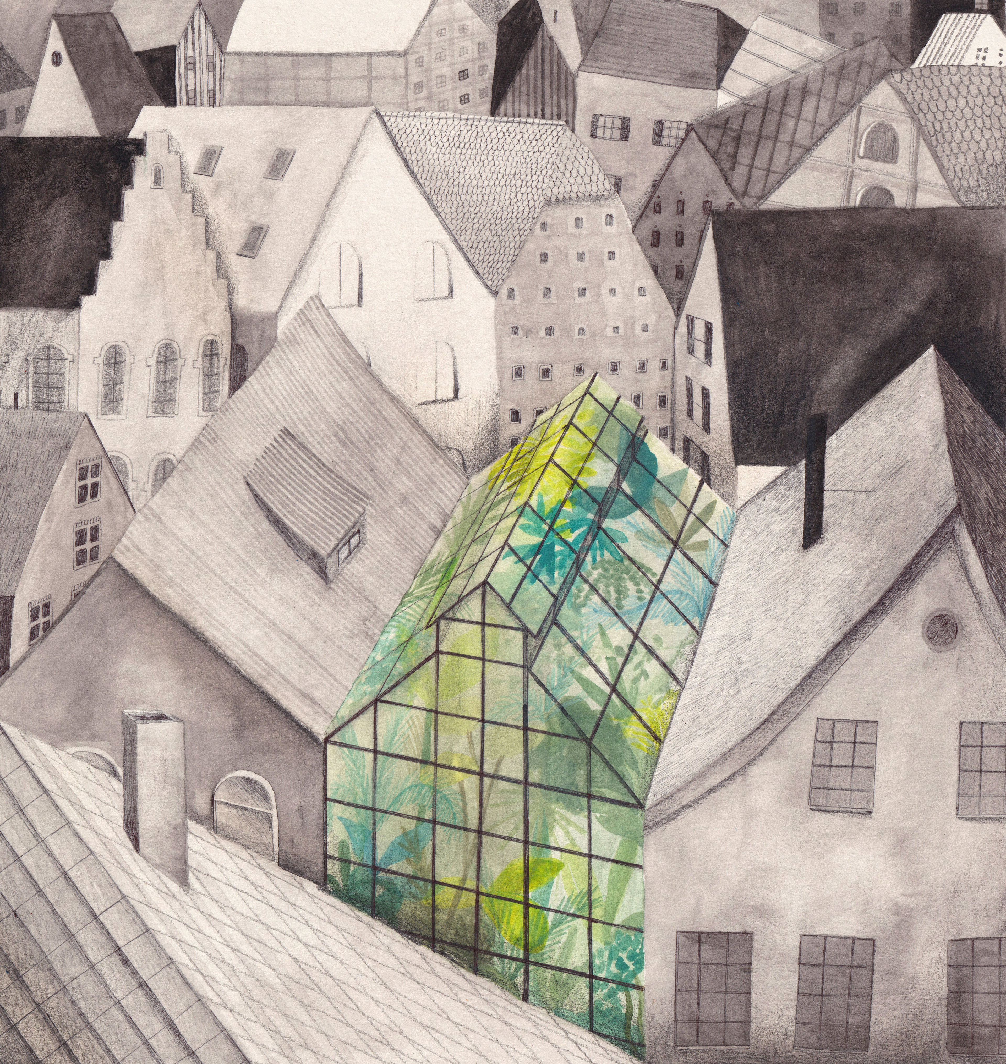 Mischtechnik aus Tusche, Gouache, Kugelschreiber und Bleistift auf Papier